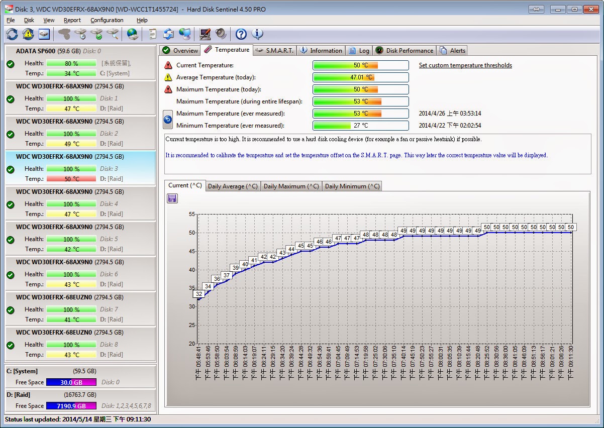 既然是要拿來當作 NAS 機,長時間運作是無可避免的,當然最重要的硬碟運作溫度自然是維持壽命不可不列如考量的重點,由於不像 Node 304 硬碟掛架設計中間有設計風流通過的間隔,DS380 的硬碟架設計並無前吹後抽的風扇設計,只能仰賴左側版的兩顆風扇吸入的風流冷卻硬碟左側,在室溫 26 ℃ 的時候勉強可以接受,隨著室溫拉到 30℃,整體溫度就讓人有點無法接受,從上面的兩張圖,其實可以很明顯的看的出來,距離機背後方風扇較遠的上面四顆硬碟溫度較高。