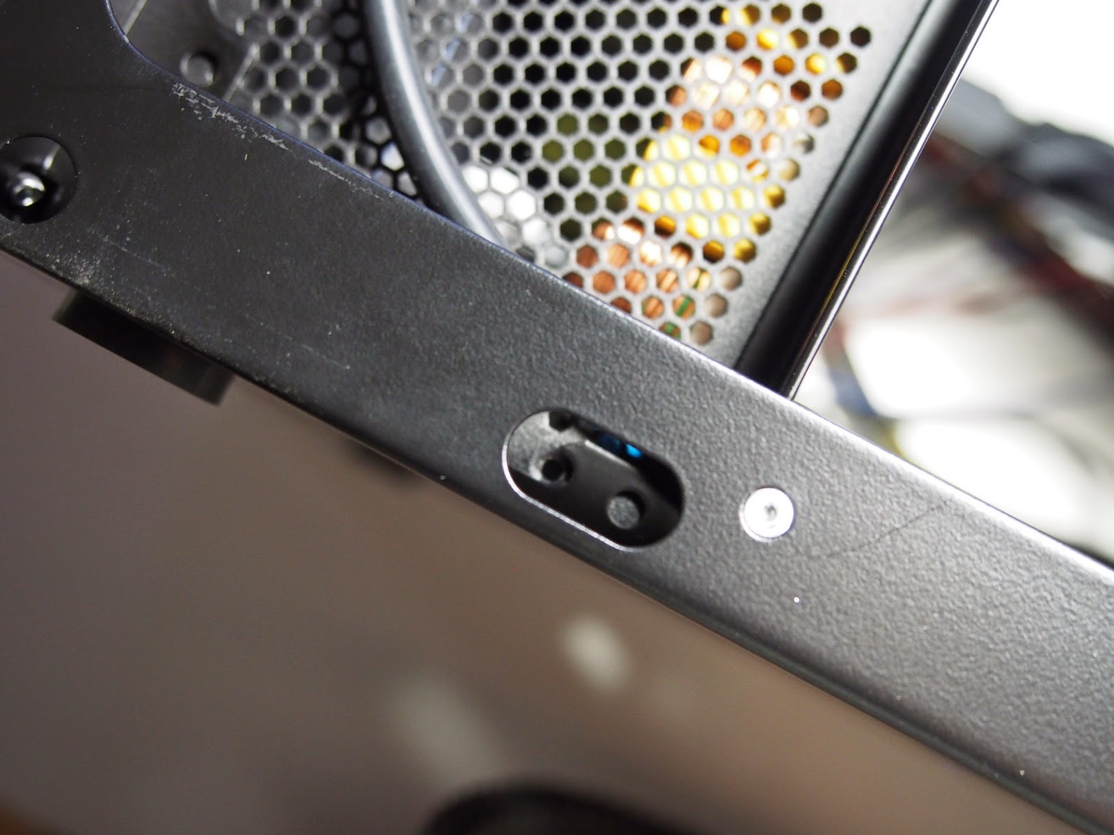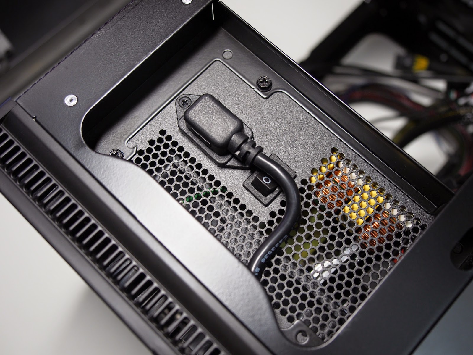 最近的機殼上置電源很喜歡開孔,老實說,不愛這種設計,畢竟都放在機殼上頭了,就不要浪費吸氣排氣的風流,輔助機殼內部的散熱,這種開孔方式,除了時間一長,機殼後半部白白一片,然後電源裡頭也容易累積灰塵