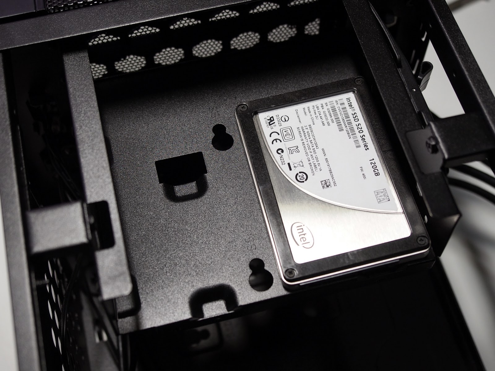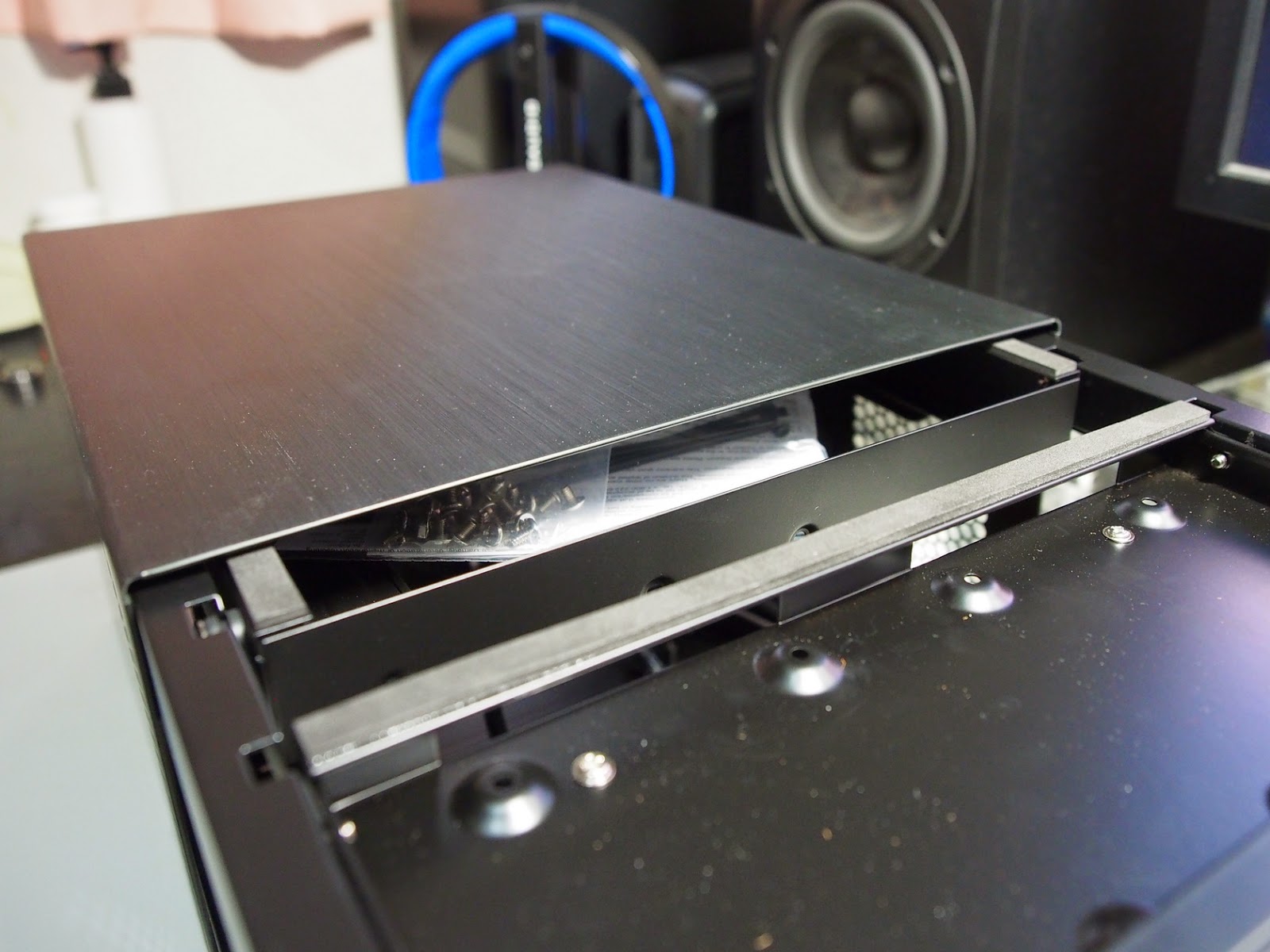 掀開上蓋殼之後,可以看到左右兩個架子,左邊是乘載硬碟,右邊是 SSD/ODD,邊框靠近上蓋的位置都有吸震海綿
