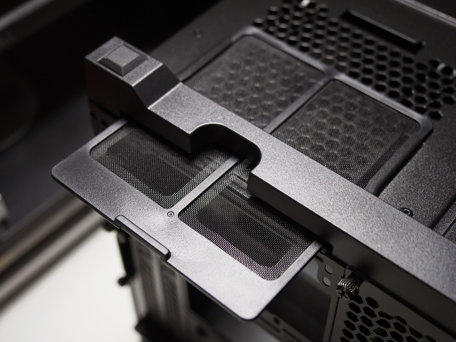 靠近顯卡位置的進氣口,濾網用軟磁鐵吸附在機殼上頭,方便拆裝清洗 |